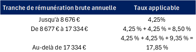 Le barème comporte un taux normal, appliqué sur le montant total des rémunérations brutes individuelles, et des taux majorés. Ils sont appliqués aux rémunérations brutes individuelles qui dépassent certains seuils.
