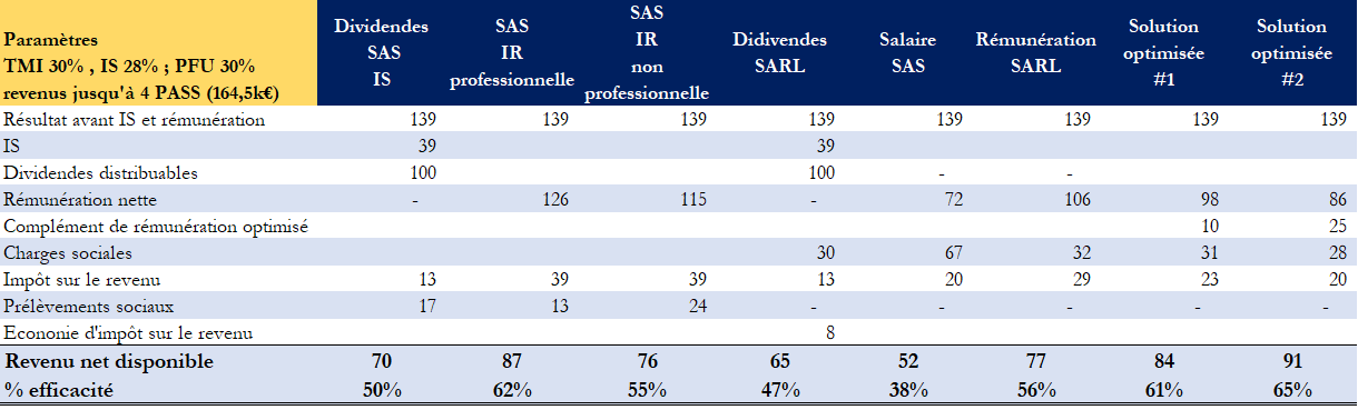- Le taux d’efficacité global de cette rémunération, une fois les cotisations sociales et l’impôt sur le revenu pris en compte, est de 53 %, ce qui est supérieur aux dividendes (50 %) d’une SAS.